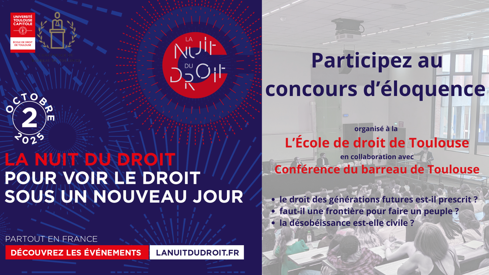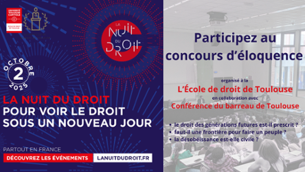 À l’occasion de la Nuit du Droit, l'École de de Droit de Toulouse organise, en collaboration avec la Conférence du barreau de Toulouse, un concours d'éloquence sur le thème "l'État de droit".