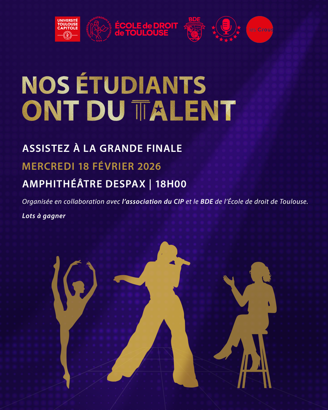 À l’occasion de la Fête du Droit, qui se tiendra du 16 au 18 février 2026 à l’Université Toulouse Capitole, l’École de Droit de Toulouse propose une programmation riche d’événements destinés à célébrer le droit sous toutes ses formes. Dans ce cadre, l’association CIP, avec le soutien du BDE de l’École de Droit de Toulouse, propose de mettre à l’honneur les étudiants en droit, de la France entière, dotés d’un talent particulier. La première édition de « Nos étudiants ont du talent » se tiendra le 18 février et marquera la grande finale de cet événement.