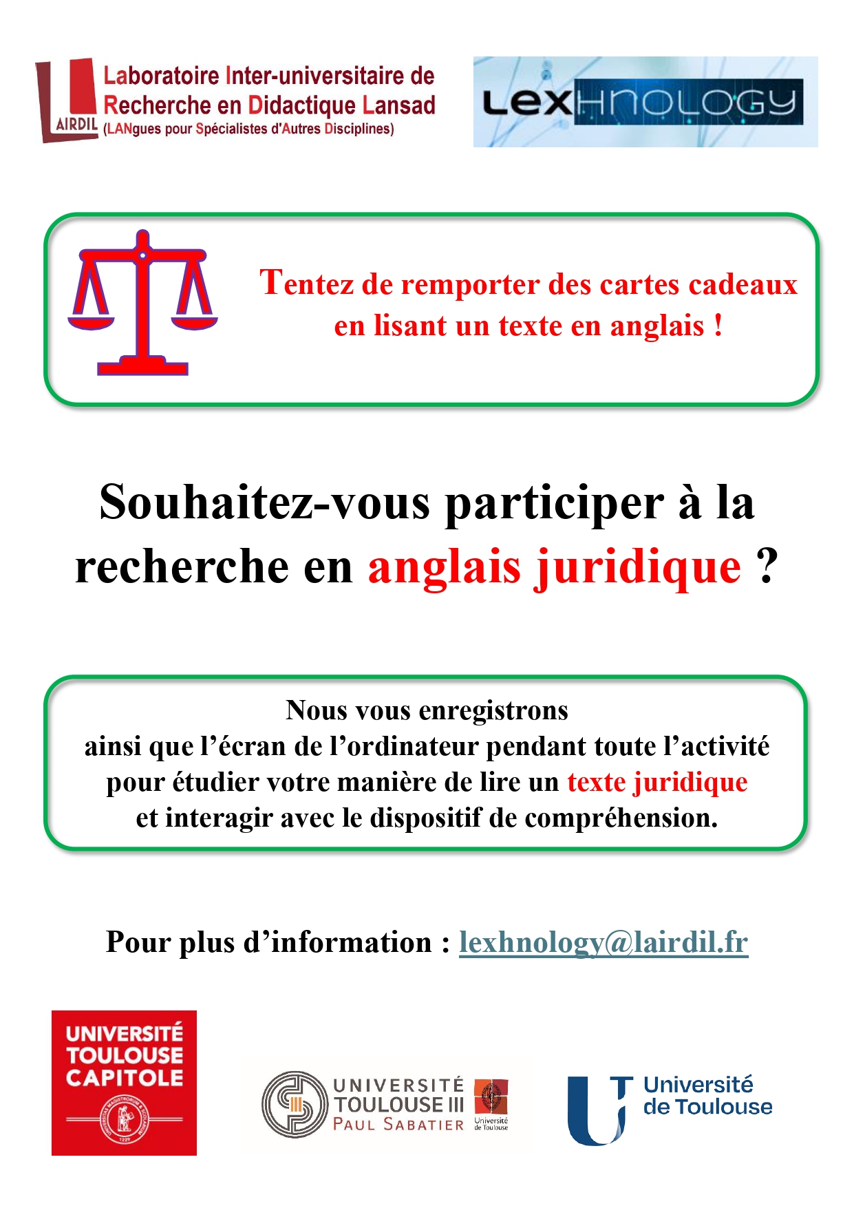 Si vous souhaitez aller plus loin, vous pouvez également participer à une étude approfondie sur cette recherche en didactique des langues. En prenant rendez-vous avec nos chercheurs, vous serez enregistré(e) pendant que vous réalisez l’activité. Notre objectif est de mieux comprendre votre manière de lire un texte juridique en anglais. Cette participation vous donnera aussi la chance de remporter une carte cadeau de 20 € chez Ombres Blanches.
