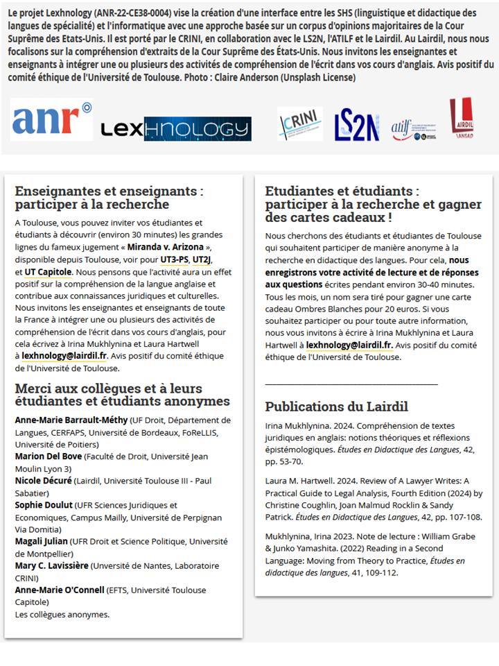 Lexhnology est un projet de recherche innovant mené par le laboratoire LAIRDIL dans le but de renforcer la compréhension de l'anglais juridique. Le laboratoire propose trois activités de compréhension écrite en lien direct avec les programmes d'anglais en L2 et M1 Droit de la Faculté de droit de l'Université Toulouse Capitole.