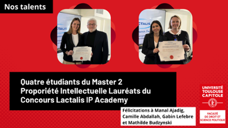 Quatre étudiants du Master 2 Droit de la Propriété intellectuelle de la Faculté de droit de Toulouse sont lauréats de la deuxième édition du concours organisé par le Groupe LACTALIS sur le thème "Les femmes et la propriété intellectuelle : accélérer le rythme de l’innovation et de la créativité".
