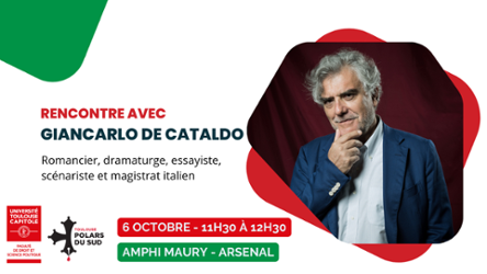 Dans le cadre du festival Toulouse Polars Sud qui aura lieu du 6 au 8 octobre prochain, la Faculté de droit a le plaisir d'accueillir, en collaboration avec le Département Langues et Cultures de l'UT Capitole et notamment avec Mme Giovanna Montermini, le parrain de cette 15e édition, M. Giancarlo De Cataldo.