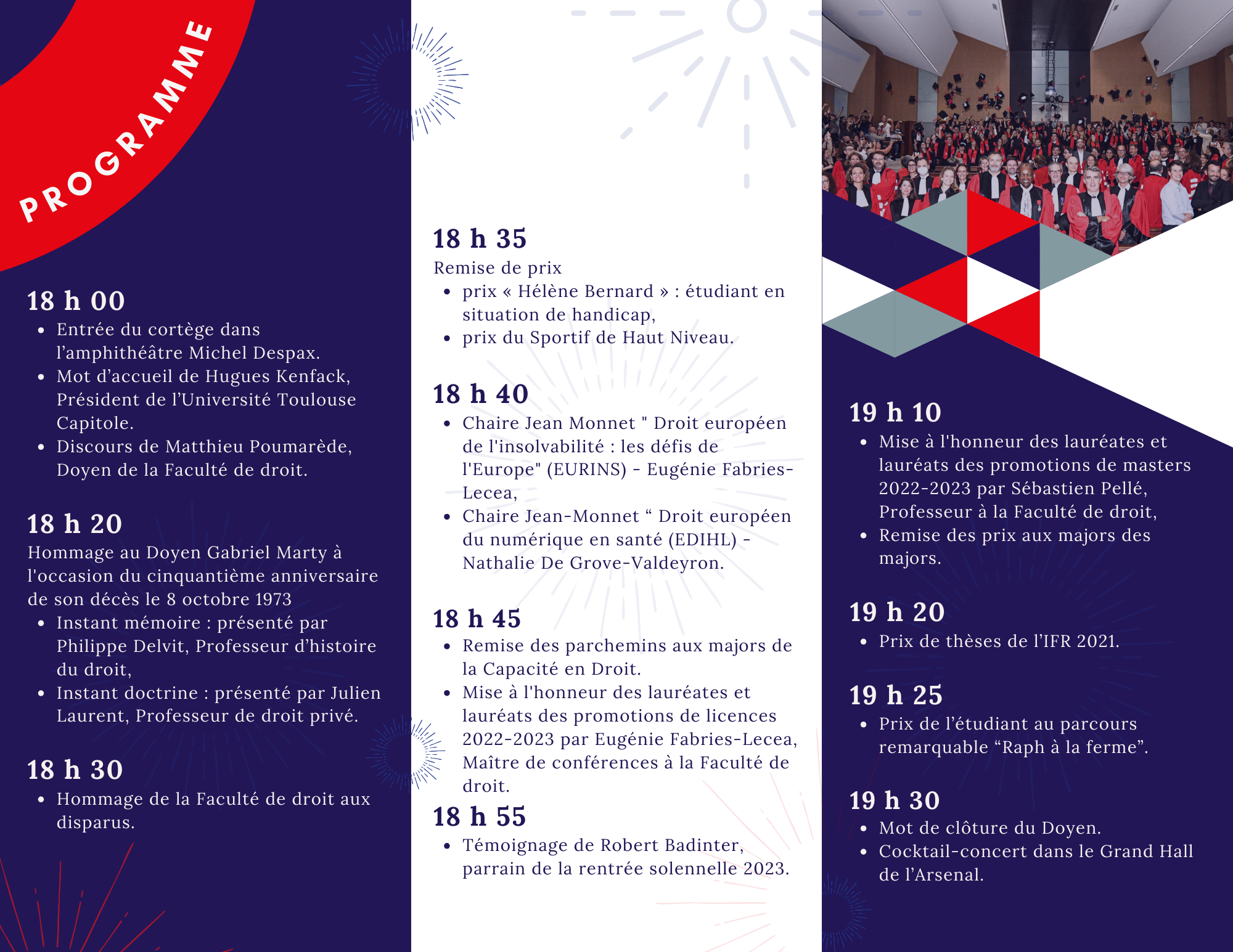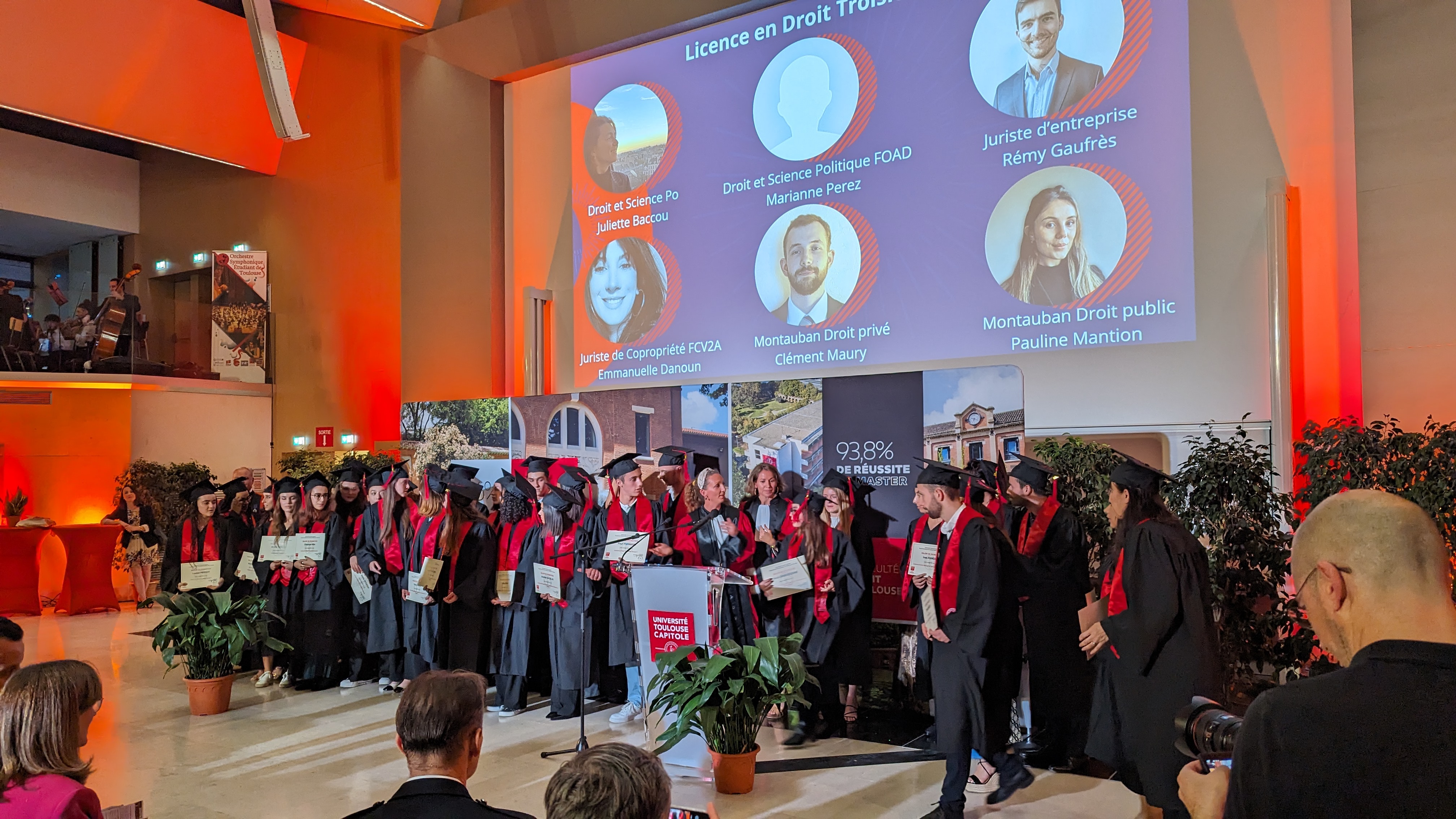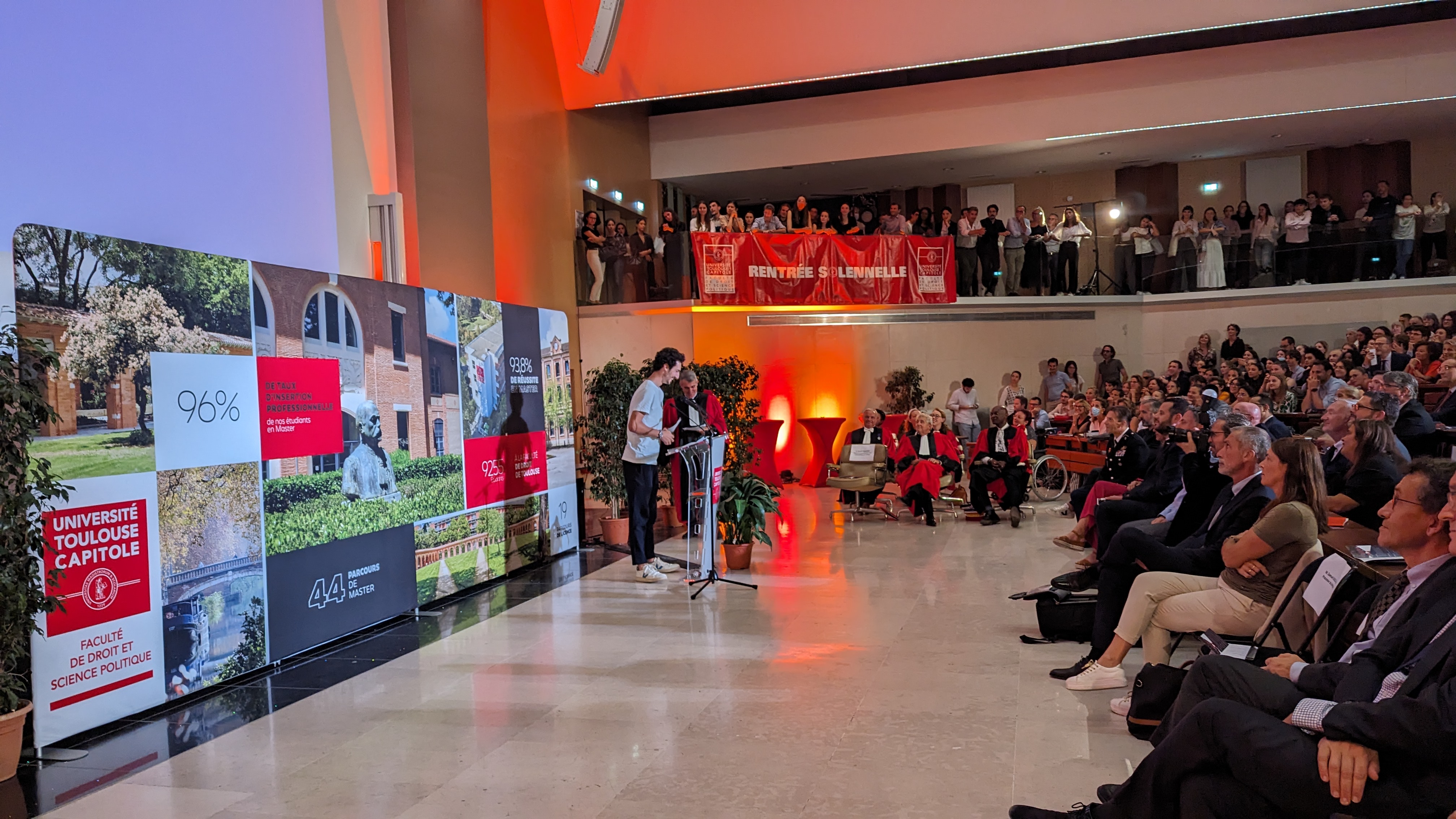 Accompagnée par l'Orchestre Symphonique Etudiant de Toulouse, la cérémonie de rentrée solennelle s'est déroulée cette année le 04 octobre dans le cadre de la Nuit du droit, en présence des majors de promotions et de leurs proches, des enseignants chercheurs, des personnels administratifs, des étudiants et de nombreuses personnalités du monde socio-économique.
