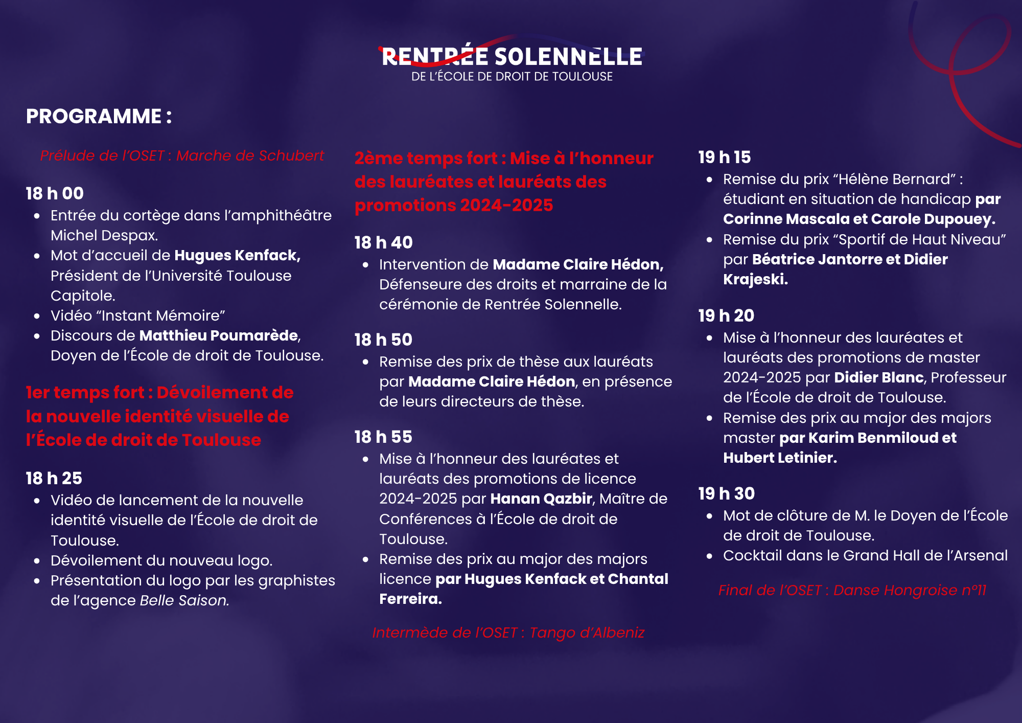 Rendez-vous incontournable de l'École de Droit de Toulouse depuis plusieurs années, la Cérémonie de Rentrée Solennelle 2025 était une édition spéciale cette année car elle a permis de dévoiler le nouvelle identité visuelle de l'École, en présence de l'invitée d'honneur, Mme Claire Hédon.