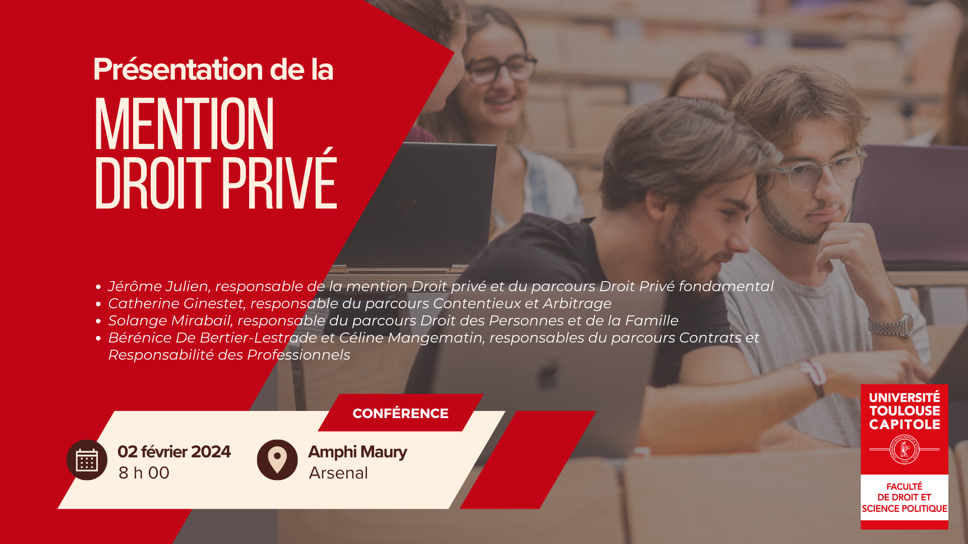 L'équipe enseignante de la Mention Droit privé organise le 2 février 2024 à 8h00 une réunion d'information destinée aux étudiants de Licence 3. Cette rencontre a pour objectif de présenter la Mention ainsi que ses différents parcours, tout en abordant les exigences relatives à la phase de sélection des Masters.