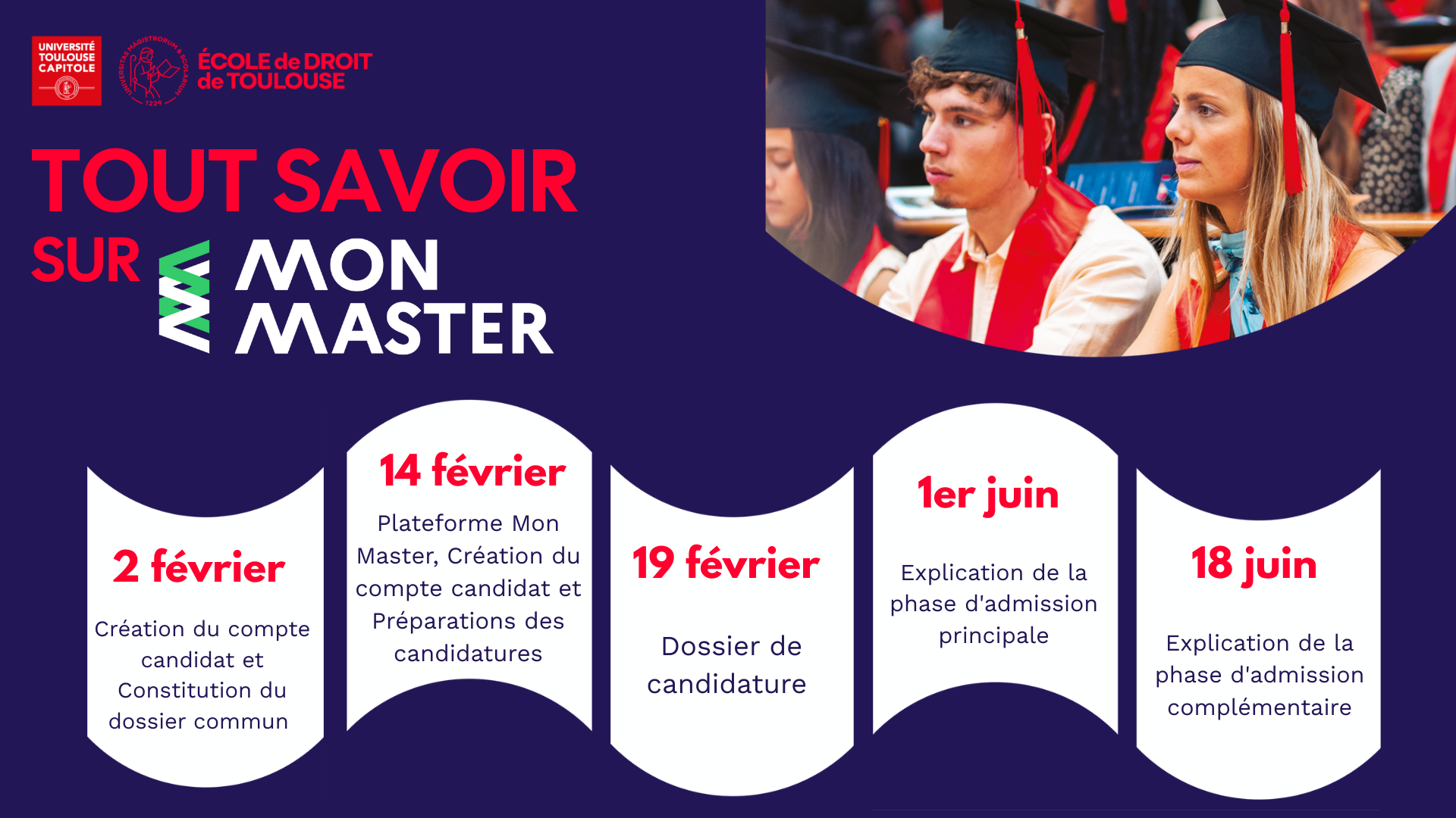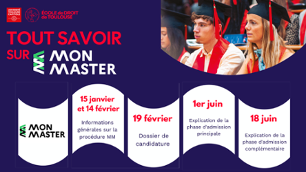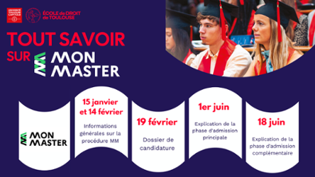 Vous êtes en Licence 3 et souhaitez candidater en Master ? Vous vous interrogez sur la plateforme #MonMaster, l’offre de formation de l’École de droit de Toulouse et la meilleure façon de remplir votre dossier de candidature ? Ne manquez pas les conférences, en présentiel et en distanciel, animées par le Doyen Matthieu Poumarède !