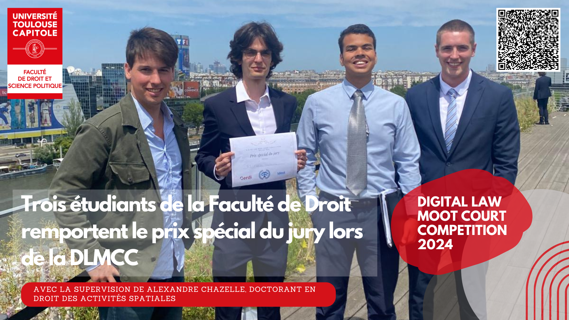 Le 28 juin dernier, trois étudiants en licence de droit ont brillamment représenté la Faculté de droit lors de la finale de la Digital Law Moot Court Competition, se hissant à la deuxième place et remportant le prix spécial du jury.