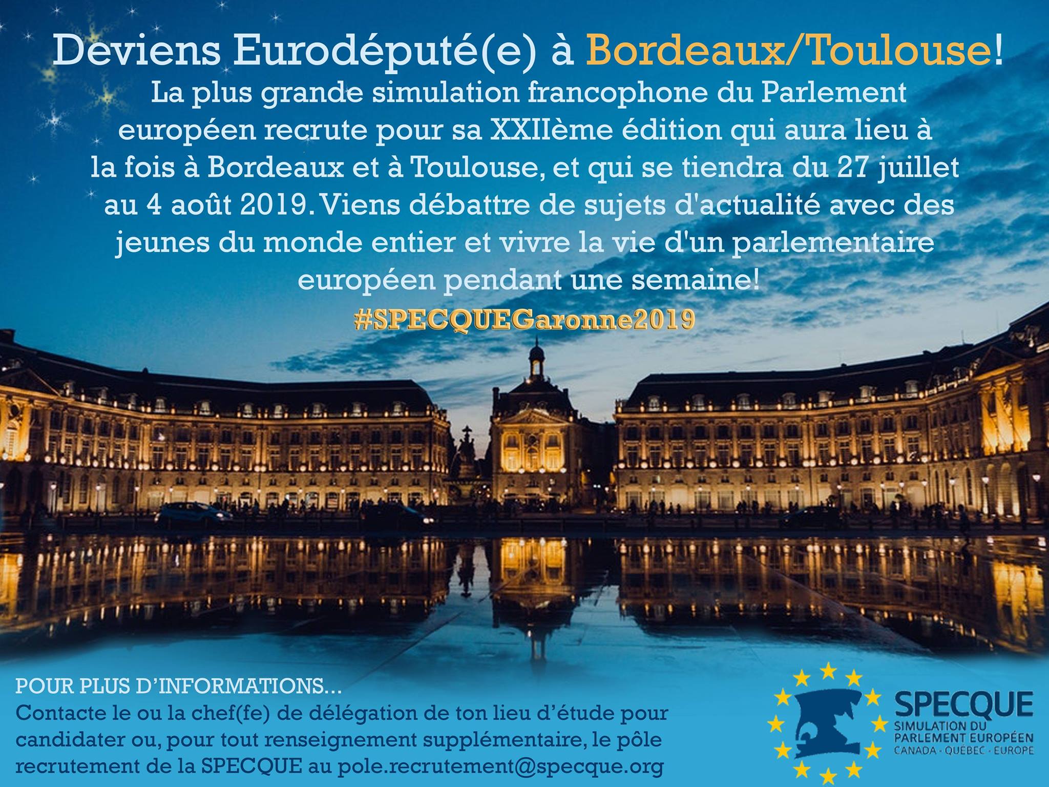 La Simulation du Parlement européen Canada-Québec-Europe 2019 aura lieu du 24 juillet au 4 août 2019 à Toulouse et Bordeaux.