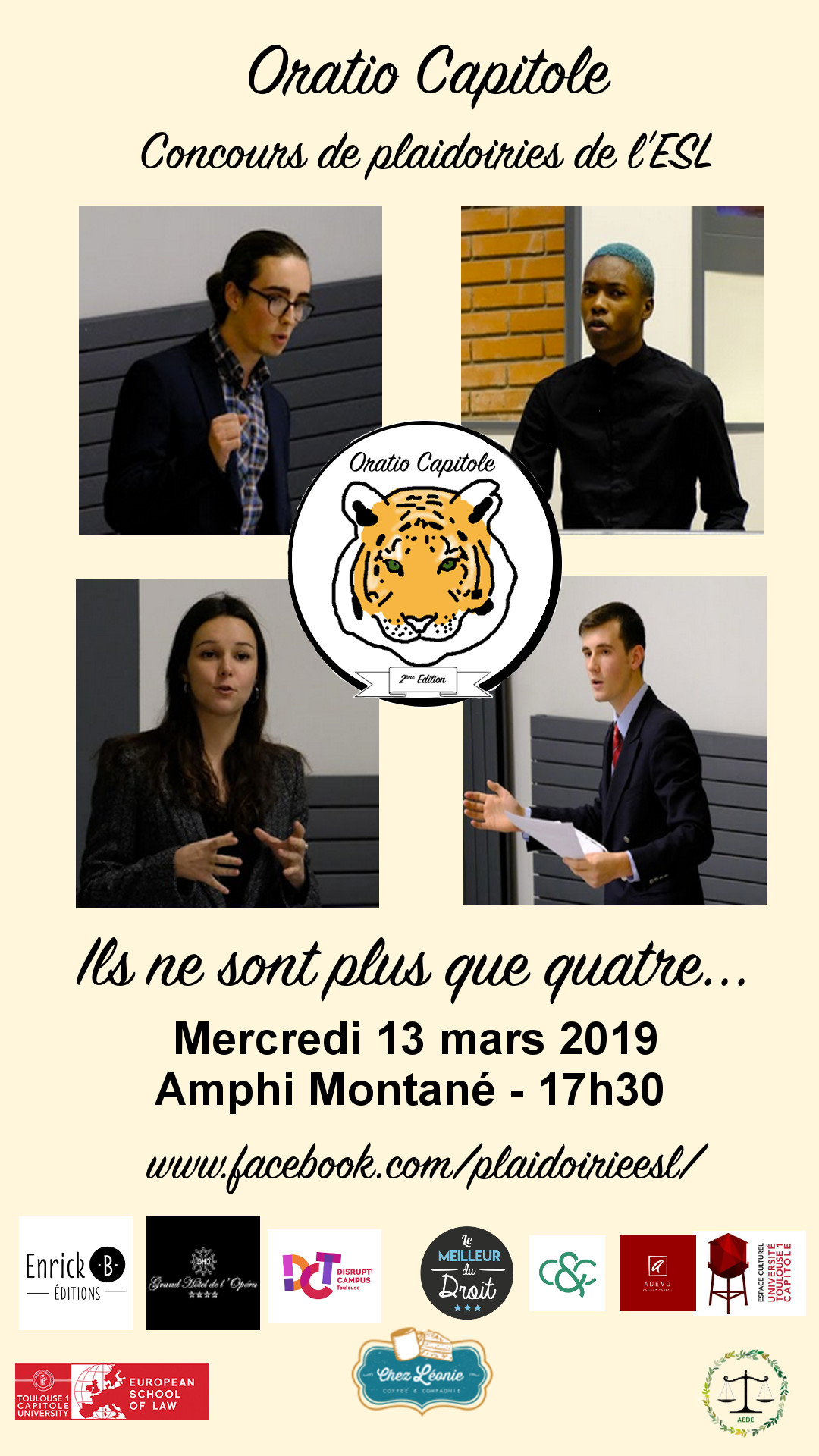 Mercredi 13 mars 2019, à partir de 17h30 à l'amphithéâtre Montané, venez assister à la finale d'Oratio Capitole, le concours de plaidoiries de la European School of Law.