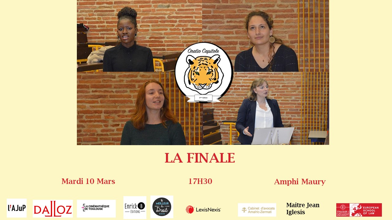 Le mardi 10 mars, c'est la Finale du concours Oratio Capitole : venez encourager les quatre finalistes, une cuvée exclusivement féminine cette année, à l'amphithéâtre Maury à partir de 17h.