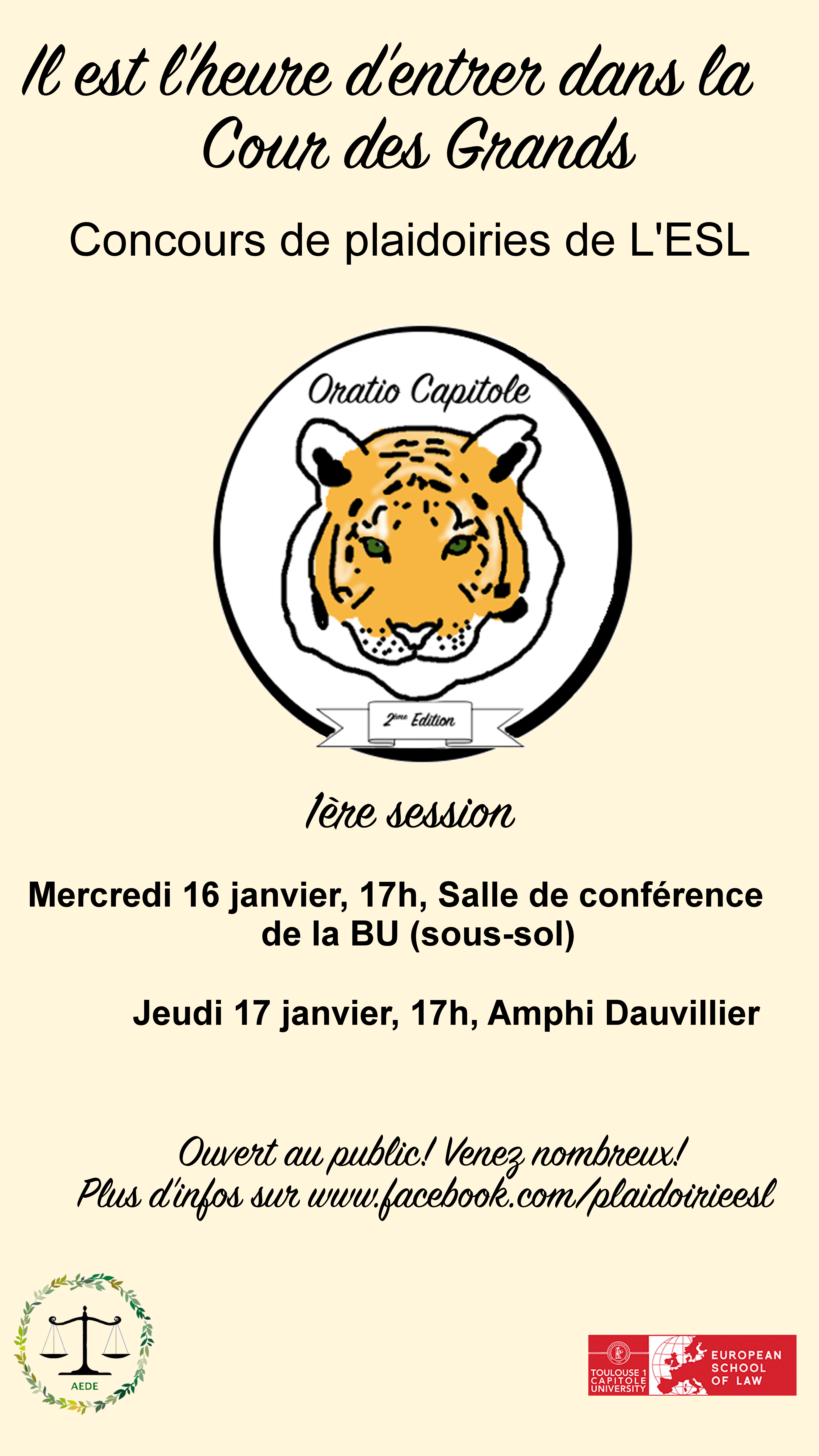 Initié en 2018 par 3 étudiants de l'ESL, l'Oratio Capitole est de retour !! Ce concours de plaidoiries, réalisé dans le cadre de l'ESL et en partenariat avec l'Association des Étudiants en Droit de l'Environnement (AEDE), vous offre encore cette année des duels de qualité sur des sujets européens et internationaux.