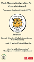 Venez écouter les plaidoiries des 33 inscrits au concours, les mercredi 16 et jeudi 17 janvier 2019.