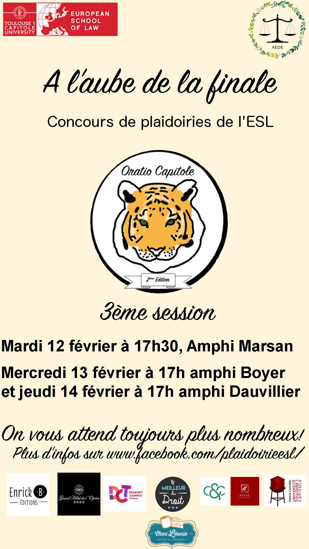 La troisième session se déroulera le mardi 12 février à 17h30 à l'amphithéâtre Marsan (Anciennes facultés), le mercredi 13 février à 17h à l'amphithéâtre Boyer (Anciennes facultés) et le jeudi 14 février à 17h, à l'amphithéâtre Dauvillier (Arsenal).
