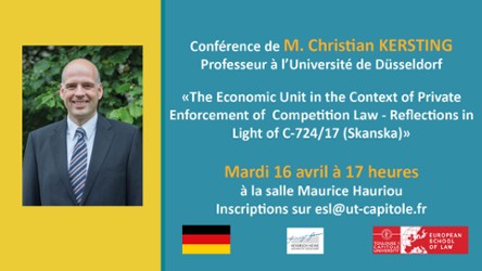 La European School of Law accueille M. Christian Kersting, professeur de droit des affaires à l'Université de Düsseldorf, pour une conférence en anglais : "The Economic Unit in the Context of Private Enforcement of Competition Law - Reflections in Light of C-724/17 (Skanska)", le mardi 16 avril 2019 à 17h en salle Maurice Hauriou.