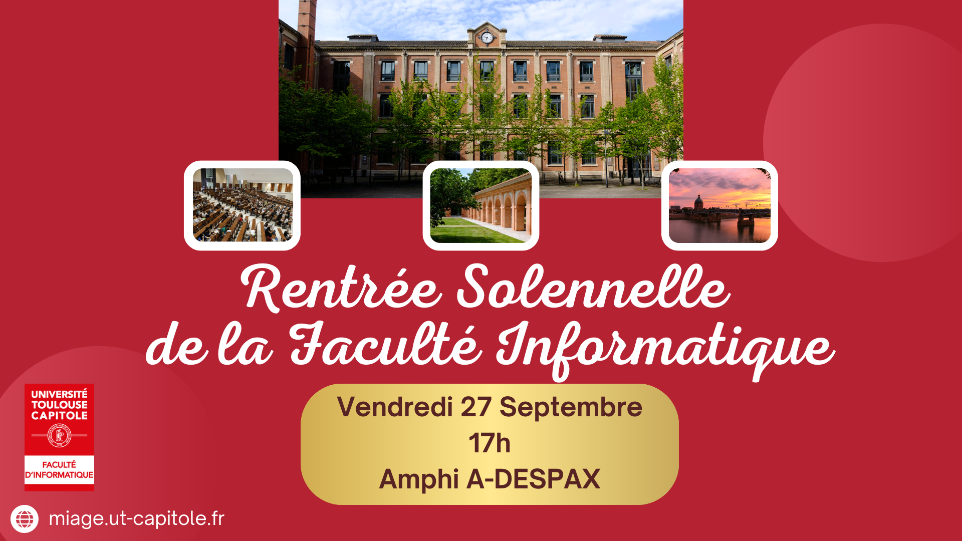 La cérémonie de Rentrée Solennelle de la Faculté Informatique s'est tenue ce vendredi 27 septembre à 17h dans l'amphithéâtre A-Despax. Retour en images sur cet évènement ayant rassemblé les étudiants et les équipes pédagogiques et administratives de l'UFR Informatique de l'Université Toulouse Capitole.
