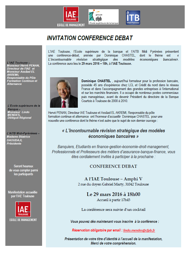 Dominique Chastel, expert de la profession bancaire et ancien Président du directoire de la Banque Courtois à Toulouse, donnera une conférence le 29 mars 2016 à 18h à l'IAE.