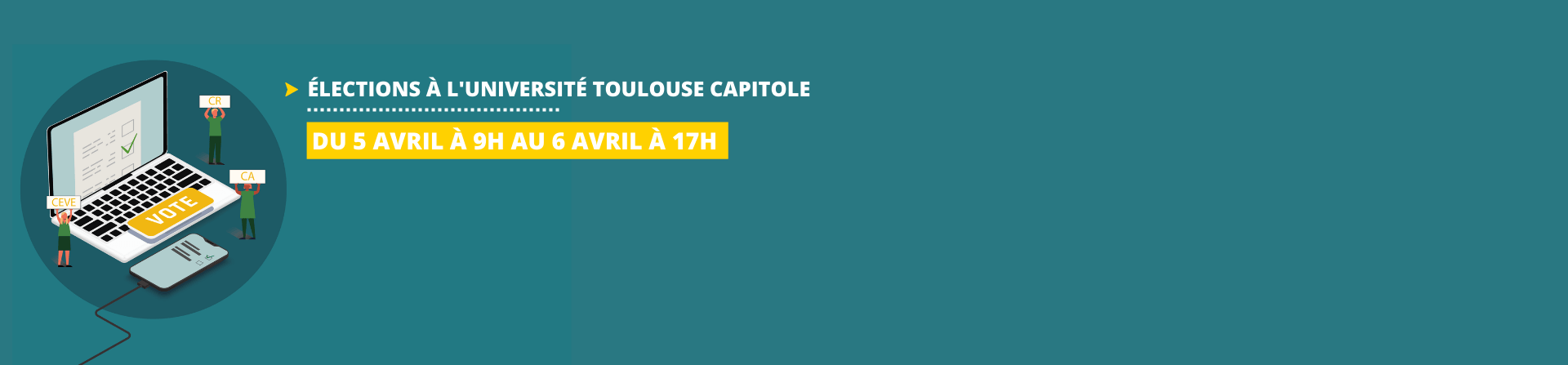 Les 5 et 6 avril auront lieu les élections des représentants des étudiants et des personnels aux conseils centraux de l'Université Toulouse Capitole : Conseil d'Administration (CA), Conseil de la Recherche (CR) et Conseil des Études et de la Vie Étudiante (CEVE).
