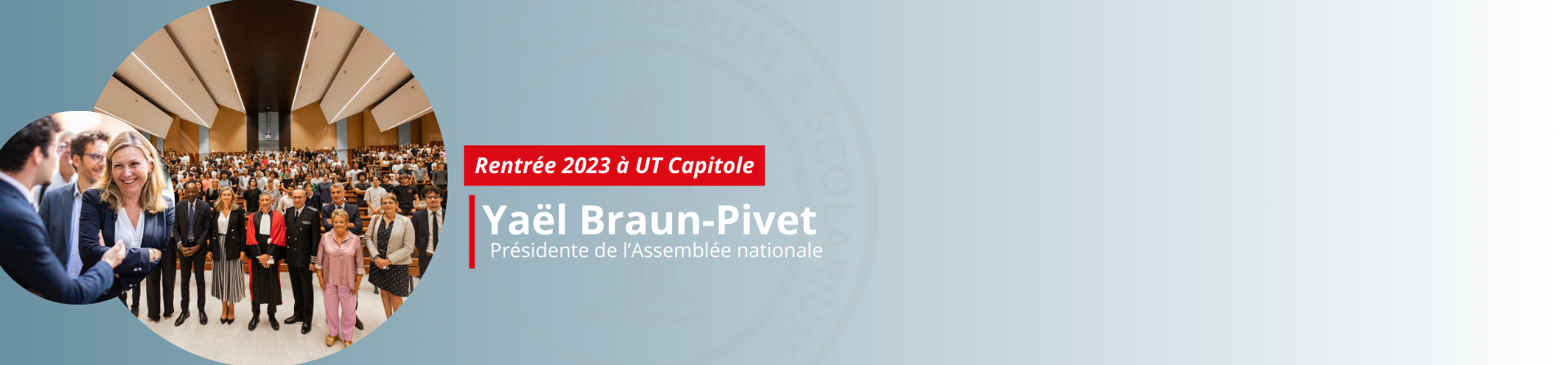« Vous êtes ici chez vous ! », a lancé Hugues Kenfack, président d’UT Capitole, à Yaël Braun-Pivet, ce vendredi 1er septembre, devant la promotion des étudiants de Licence 1 AES, dont elle est désormais la marraine. En effet, la présidente de l’Hémicyle, avocate de profession, est titulaire d’un Master 2 Droits des Affaires, parcours type Juriste d'entreprise, obtenu dans notre université en 2012.