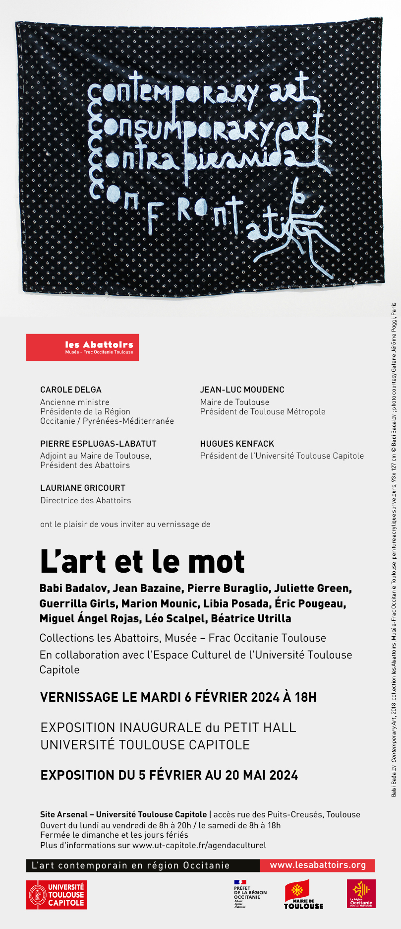 The inaugural exhibition of "Petit Hall" at Toulouse Capitole University brings together works that highlight the interactions between image and word, between reading and perception. The use of words in art emerged with the avant-garde movement of the early 20th century.