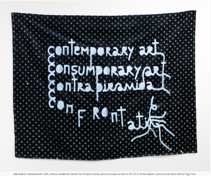 This close relationship has continued to assert itself in contemporary art right up to the present day. The word has become an aesthetic form in the same way as color and form, serving a poetic language, existential questioning, memory... (Jean Bazaine, Pierre Buraglio, Juliette Green, Éric Pougeau, Léo Scalpel, Béatrice Utrilla). The use of words is also a political act that takes the form of manifesto works by activist artists who are determined to challenge the dominating authority (Babi Badalov, Guerrilla Girls). While others (Marion Mounic, Libia Posada, Miguel Ángel Rojas) denounce injustice and try to make the voices of the oppressed heard.