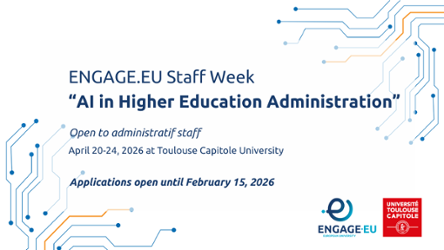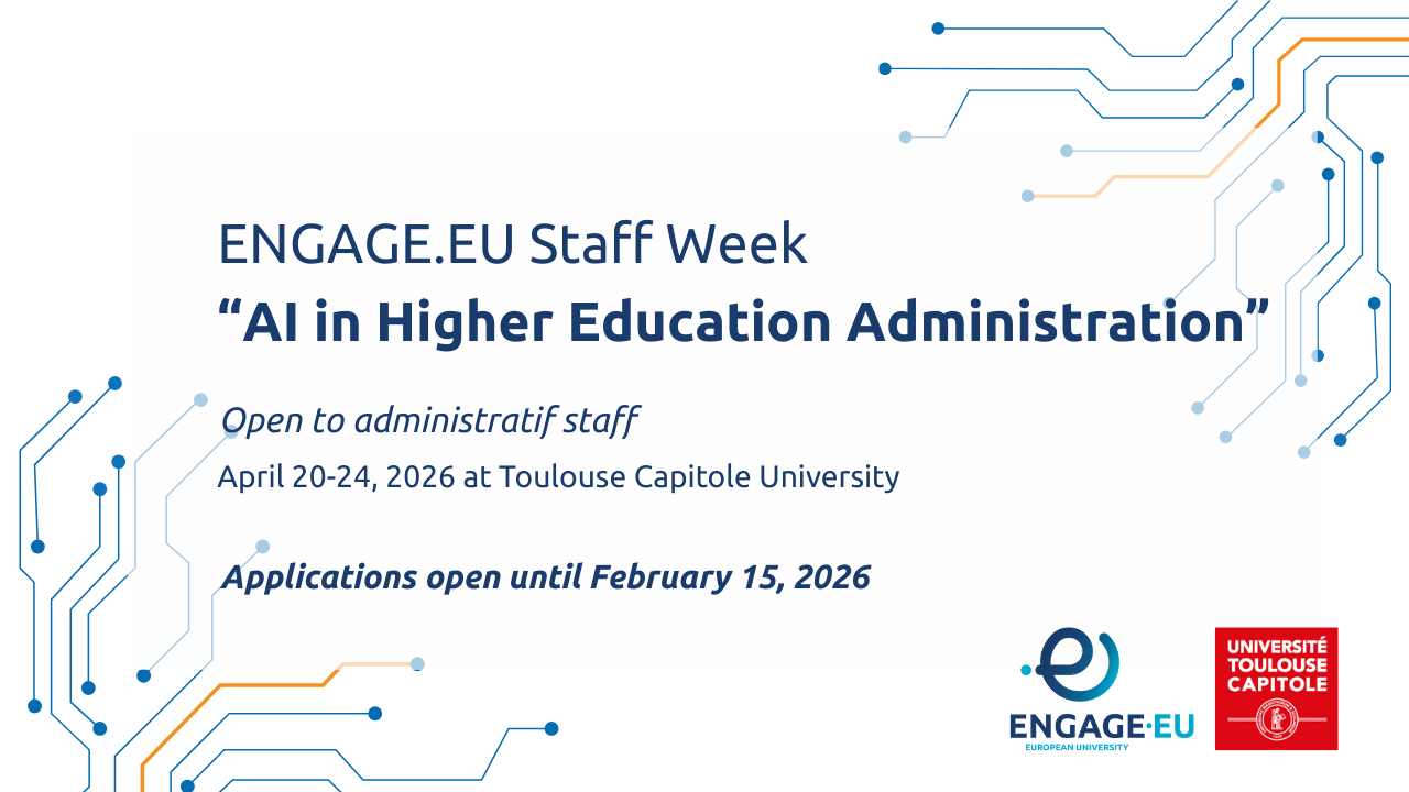 Administrative staff, take part in the ENGAGE.EU training week on artificial intelligence in higher education administration, organised by Toulouse Capitole University from 20 to 24 April 2026. Develop your network and explore new ways of integrating AI into your work. Apply before 15 February 2026!