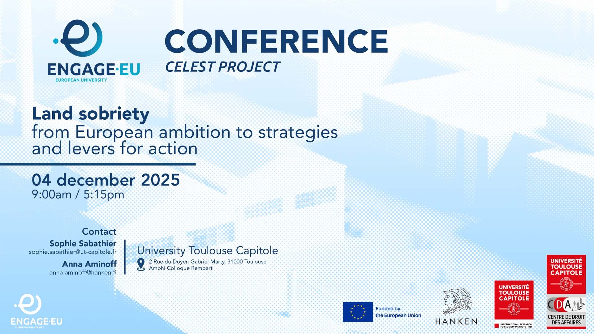Engage with us during this impactful CELEST project conference on December 4th, 2025 from 9 am - 5:15 pmin Rempart conference lecture hall as we hear from experts in the field of land sobriety from ENGAGE.EU partner universities and organisations including the Hanken School of Economics (Helsinki), WU (Vienna), LUISS University (Rome), the City of Helsinki, Akanthas, the National Institute for Circular Economy, the Land Transition Institute, Toulouse Métropole, Cerema Occitanie, and Toulouse Capitole University.