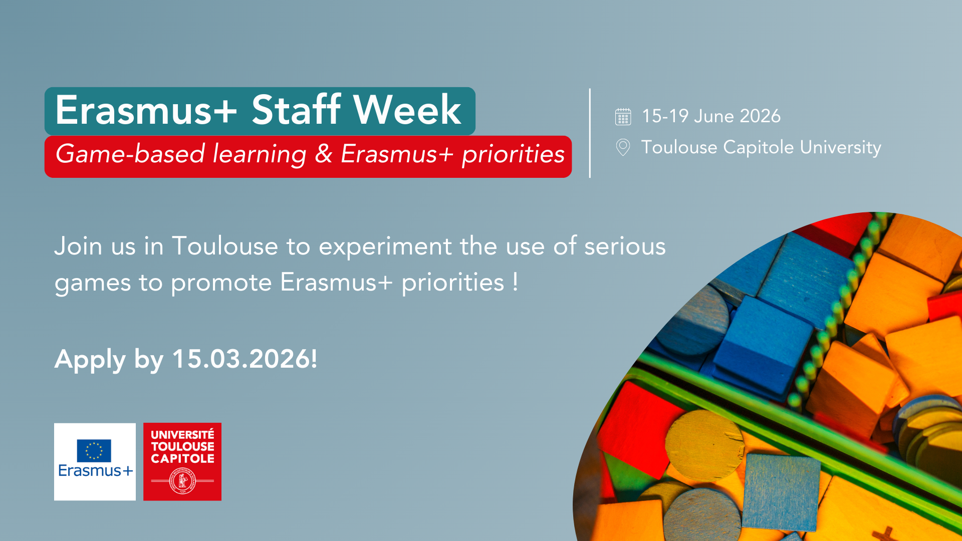 We look forward to welcoming you to Toulouse in June 2026 for a creative and collaborative Erasmus+ Staff Week dedicated to learning through play!